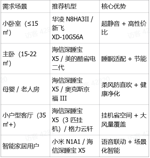 5.适用场景:1 匹(10-15㎡小卧室)、1.5 匹(15-22㎡主卧)、3 匹挂机(35㎡+ 小户型客厅)。