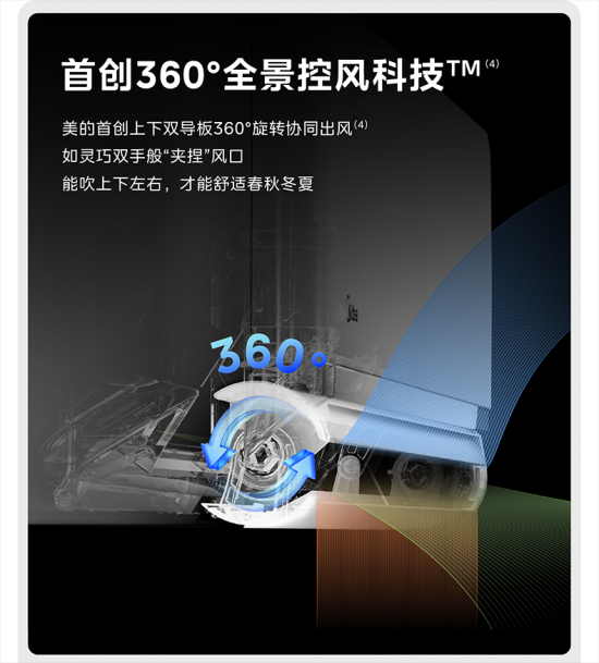 另一大核心亮点是灵感源自航空二元矢量控风技术的360°全景控风科技,该技术在风尊二代“180°旋转控风”的基础上进行了技术升级,搭配行业首创的360°旋转双导板,可实现多样化出风组合。夏天6米贴顶送风,冷风不直吹人体;冬天4米贴地暖流,暖从脚起不燥脸。配合9米远距离送风与820m³/h大风量,消除全屋温差,安装不受位置限制,真正实现了全屋空气的高效流动与焕新。
