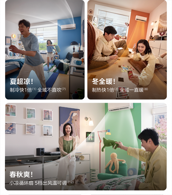 从解决冷风直吹,到首创四季空调,美的全面风·风尊三代再一次实现空调行业的升维突破,春解闷、夏消暑、秋除燥、冬送暖,以全能姿态重新定义空调,守护四季品质生活,这不仅是美的空调的技术革新,更是对亿万用户品质生活需求的回应——行业首创,只为四季皆舒适!